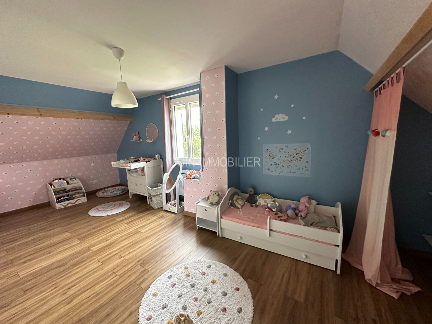 A l'étage : palier, 2 grandes chambres, un débarras, salle de bains et WC.